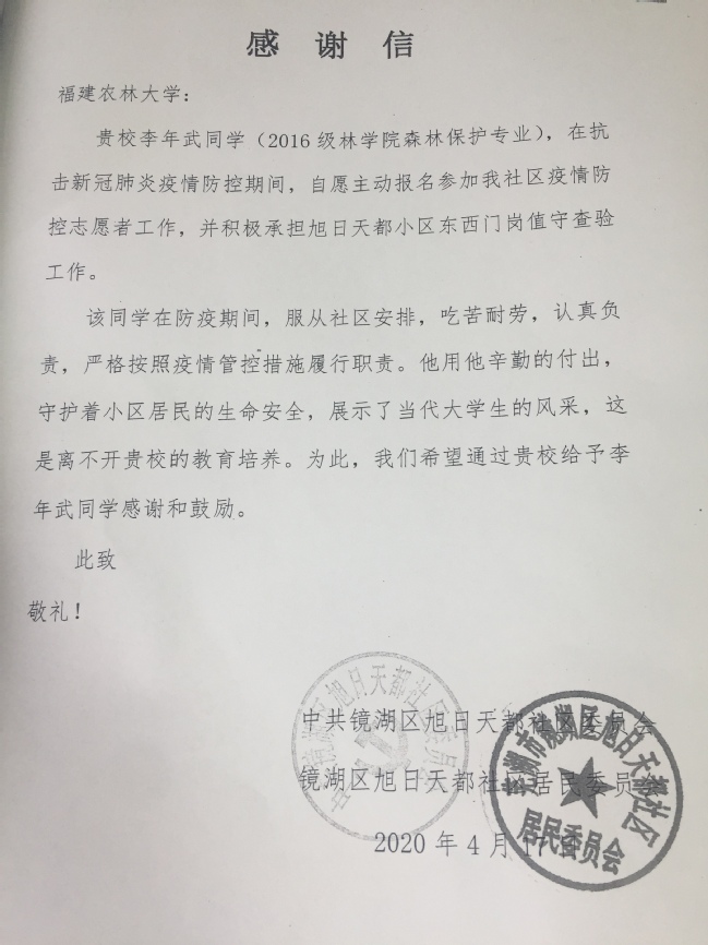 近日,安徽省芜湖市中共镜湖区旭日天都社区委员、镜湖区旭日天都社区居民委员会向我校发来感谢信,表扬和感谢我校2016级林学院森林保护专业李年武同学在疫情防控期间主动参与抗疫志愿者工作。