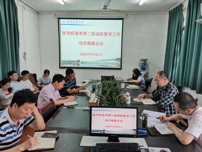 5月27日下午,林学院在石仓楼三楼会议室召开春季第二批返校复学工作动员部署会。院党委书记蓝天水、院长马祥庆、院党委副书记李梅生、副院长余坤勇、郭福涛,以及全体政工干部参加会议。