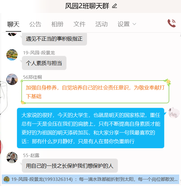 2019级风景园林专业的朱敏同学表示:“没有人生来就是英雄,一场突如其来的疫情,让我们看到了许多平凡人身上闪耀的英雄光环。而在这场与看不见的病毒的生死较量中,正是这些平凡的普通人挺身而出,用血肉之躯筑成钢铁长城,以最美逆行奏响生命之歌,让我们在寒冷的风雪中,看到了春天的希望,坚定了必胜的信念。”