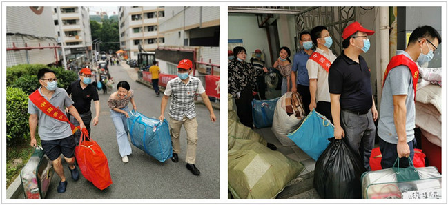 教工党员志愿者给学生搬运、整理行李