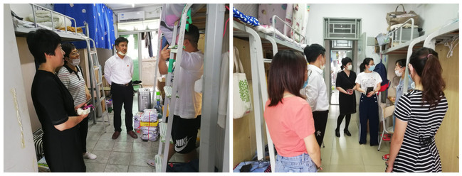 在北苑、东苑学生宿舍,院领导详细询问了返校学生的健康状况、心理状态、学习情况和大家目前的就业情况,对返校同学表达了深切的关心,并鼓励同学们积极面对当前就业形势,学院会指导大家完成学业,积极收集就业信息,尽最大努力给同学们提供就业机会。交谈中,老师们还叮嘱学生要严格遵守学校的管理规定,尽量不外出;做好防护措施,宿舍卫生清洁通风,规范佩戴口罩,勤洗手,按时做好“每日健康报告”和“早中晚体温监测”等工作,有特殊情况及时报告。
