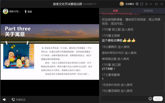 最后,经激烈角逐、现场评委打分和场内外投票结果统计,分别由东6#701、东2#402和南3#146获得了舍标、舍歌MV和宿舍风采展比赛的一等奖,其余24间宿舍也分获二等奖、三等奖和优秀奖。