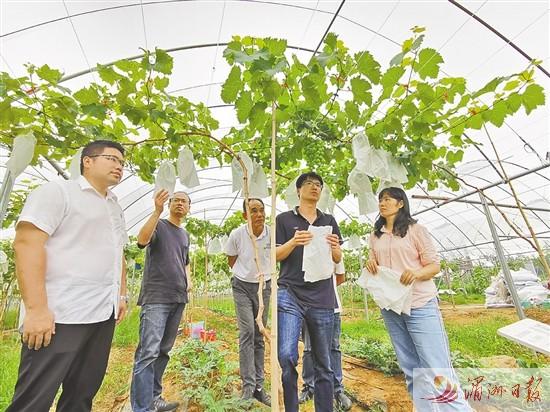 “套袋处理能够减少病虫害,对产量和品质提升也有很大帮助。所以我们套袋时一定要把整串果子套进袋子,再进行密封处理。”5月28日,在秀屿区东庄镇营边生态休闲农业园,开云网页版生命科学学院教授、博导吴则焰带着青年博士,向农业园的技术人员讲授葡萄套袋技巧(如图)。再过20来天,这里多达8种的葡萄就将成熟。
