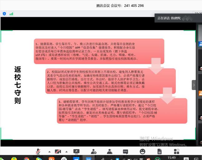 课上,陈建辉表达了对学生返校的期待,并详细介绍了学生返校后疫情防控工作的安排。他指出,返校学生需满足“四大条件”,即身体状况健康、获得八闽健康码与返校报到码、完成学生本人人脸信息采集以及备好学生卡与身份证等必备用品。其次,学生在返校途中应当注意全程做好个人防护、合理规划返校行程、做好自身健康监测等。同时,学校在火车站与机场等设立学校接待点、在校内设立四个接待点,实行半封闭式管理;学生在返校后应按照“一测二核三扫四通过”原则,并遵守健康监测、请销假管理、校园与公寓封闭式管理、用餐管理、会议和活动管理以及宿舍卫生管理等“返校七守则”,做到以人为本,把握主动,积极预防,快速反应,不留死角,不漏一人。