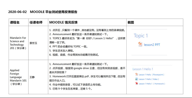 目前,通过团队的共同努力,德班孔院全体教师已在Moodle平台上完成了各项功能的测试,熟练掌握了包括课件、录音、视频文件上传以及作业布置、提交、评估等环节的操作。公派汉语教师雷妤对各位老师的课程测试进行了审核,并给出了详细的反馈意见,解决了存储空间、视频权限、格式规范等问题。