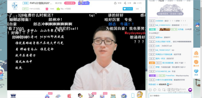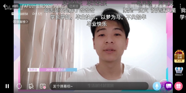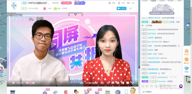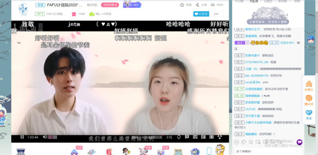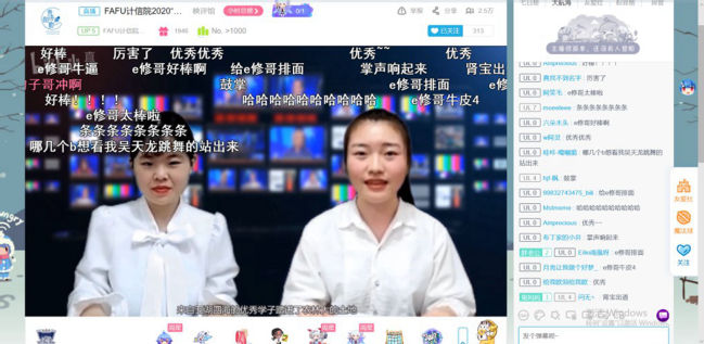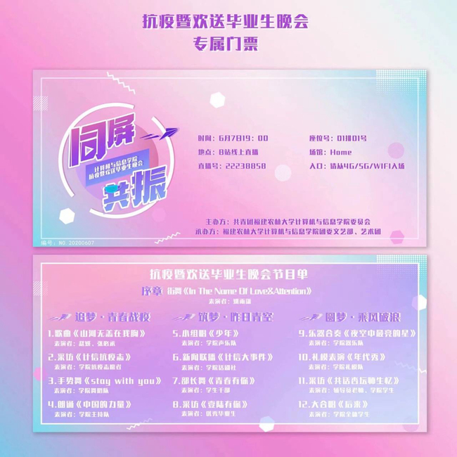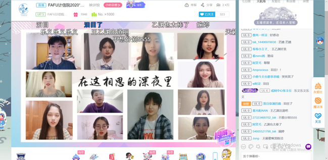 6月7日晚,计算机与信息学院“同屏共振”抗疫暨欢送2020届毕业生晚会在哔哩哔哩网站准点上线。晚会通过线上直播的方式进行,共有近2.7万人次同步收看了在线直播。晚会主题鲜明,直播间气氛热烈。一个个精彩纷呈的节目、一条条真情朴素的弹幕,既讴歌了在疫情防控阻击战中涌现出的广大抗疫先锋们,又寄托了学院全体师生对2020届毕业生们的殷殷期盼和诚挚祝福。整场晚会共分为三个篇章,晚会在创意定格动画《四计有你》和街舞《In The Name Of Love & Attention》中拉开了序幕。