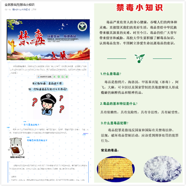 据悉,学院发布禁毒知识海报、科普推文,各年级辅导员召开禁毒宣传教育大会,多维度深层次地推进禁毒教育,进一步强化大学生毒品预防教育,进一步提升广大青年的禁毒意识和拒毒防毒能力,充分激发学生参与禁毒教育的积极性和创造性,切实肩负起反毒禁毒的责任和使命。