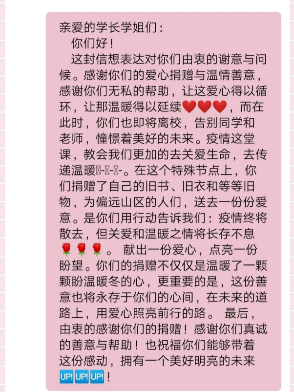 活动前期,通过线上宣传,学院呼吁已返校的大四毕业生以自主自愿为原则,捐物赠暖,齐献爱心。活动期间,毕业生们无私捐赠闲置物品,包括书本、衣服、电器、生活用品、运动用品等,并通过纸条留言等形式向身处困境的人积极传递正能量。小小旧物背后凝聚着毕业生们对偏远贫困地区人民的爱。活动后期,各班级负责人将旧物进行统一整理清点、消毒处理,并及时进行爱心捐赠。