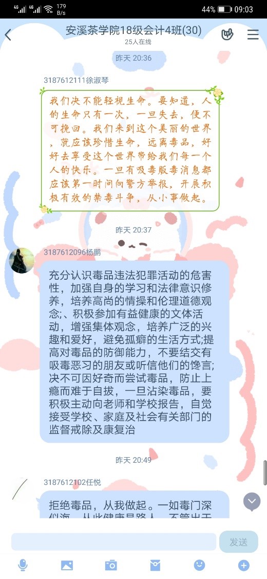 活动期间,线上各班级通过组织召开班会、团组织生活会、安全教育大会、集中观看禁毒公益视频及推送国家禁毒委发布的毒品基础知识等形式,学习了解国家禁毒工作的方针和政策。同时,各班级支书充分利用QQ群、微信群、腾讯视频会议、智慧团建等平台,开展线上讨论和交流,加强同学们对毒品危害性的认识,远离毒品。