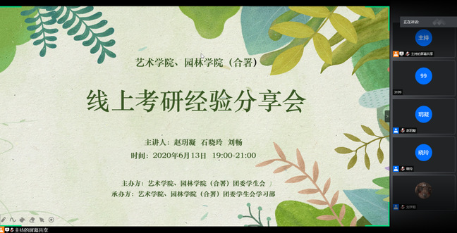 6月13日晚,艺术学院园林学院通过腾讯会议平台举办线上考研经验分享会。会议邀请2016级优秀考研学生代表赵玥凝、石晓玲、刘畅分享考研经验,学院70余名学生参与此次线上分享会。