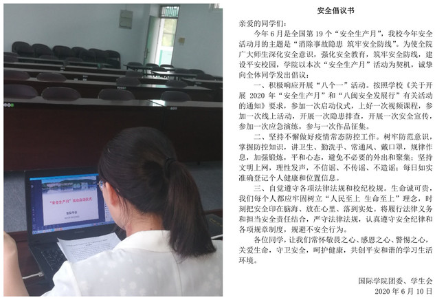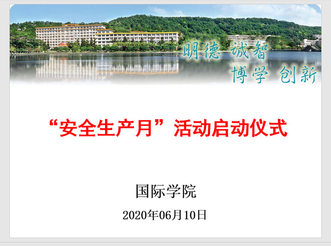 按照学校《关于开展2020年“安全生产月”和“八闽安全发展行”有关活动的通知》要求,近日,国际学院分别在全院教职工和学生群体中开展“安全生产月”系列活动启动仪式。