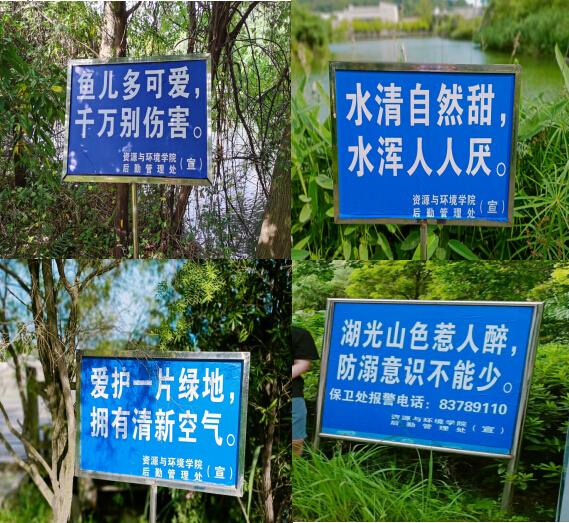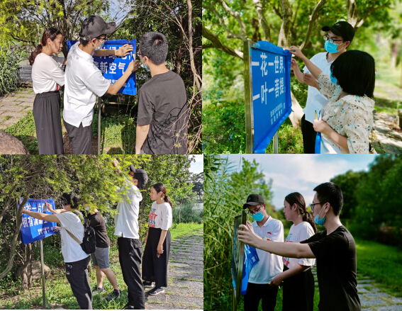 活动中,学生党员顶着烈日、冒着酷暑,带着制作好的文明标语,对校内旧的警示、提示宣传标语进行更新,重点对观音湖区域、湿地公园区域的警示、提示宣传标语进行更新。