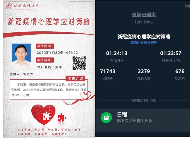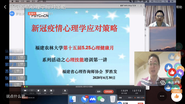 6月30日,我校通过云端举办“新冠疫情心理学应对策略”心理讲座,本次讲座是第十五届“5·25”心理健康月系列活动之心理健康教育工作队伍心理技能培训的第一讲,由学工部、研工部、学生处(合署)主办,管理学院(旅游学院)承办,面向辅导员、班主任、导师、专任教师、学生,共吸引了两千多位师生在线参与,直播点赞互动数达7万余次。