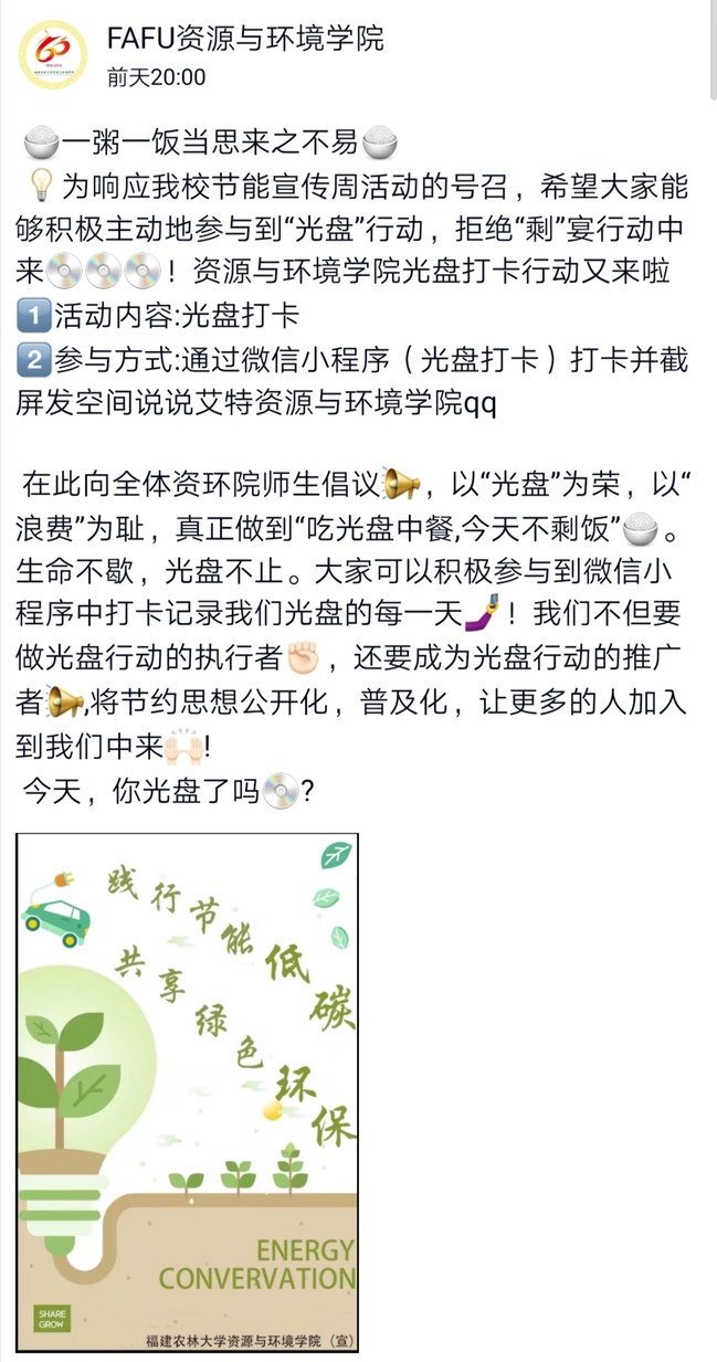 近日,资源与环境学院按照学校2020年节能宣传周广泛开展“节约粮食、反对浪费”活动要求,通过打卡小程序组织师生开展“光盘行动”。