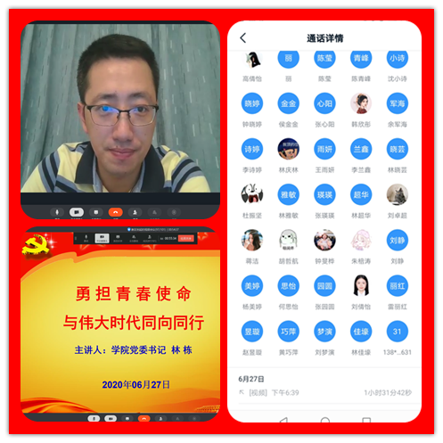 组织云端开展毕业生党员“最后一课”。学院在线上平台开展2020届毕业生党员“最后一课”活动,毕业生党员代表分享自己坚定理想信念、勤学笃行、知行合一的成长经历。学院党委书记林栋结合抗击新冠肺炎疫情的鲜活事例讲授党课,鼓励毕业生党员坚定理想信念,用硬核的专业本领来回应时代的挑战,奋力担当时代的使命。