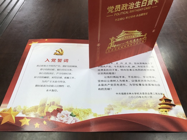 政治生日贺卡印有入党誓词,标注了每位党员的入党日期和党龄。在生日寄语中,希望每位党员不忘初心、牢记使命,坚持以立德树人为根本,以强农兴农为己任,永葆共产党员先进性,为学校事业发展做出应有的贡献。