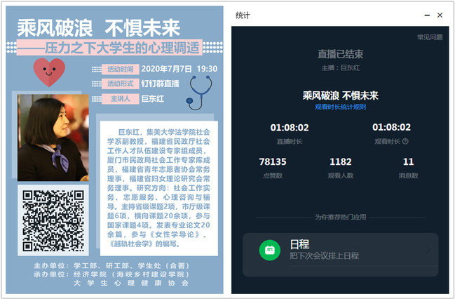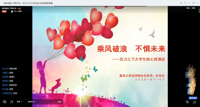 7月7日,我校通过云端举办第十五届“5.25”心理健康月系列活动之心理健康系列讲座第三讲。本次讲座由学工部、研工部、学生处(合署)主办,经济学院(海峡乡村建设学院)、大学生心理健康协会共同承办,讲座共吸引了一千多位同学在线参与,直播点赞互动数达七万余次。