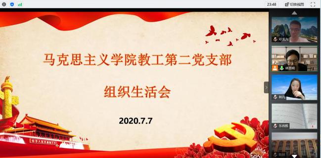 7月7日下午,马克思主义学院教工第二党支部开展了一次特殊的“云端”组织生活会,围绕“迎党的生日、讲战疫故事、悟初心使命”主题畅谈心得体会。会议由支部副书记林凡主持,院党委书记连文以及副院长李宝艳列席会议,全体党员参加会议。