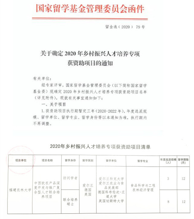近日,国家留学基金管理委员会下发《关于确定2020年乡村振兴人才培养专项获资助项目的通知》,我校副校长郑宝东负责的“中西欧农产品深度开发与推广复合型人才联合培养项目”经审批获得资助。