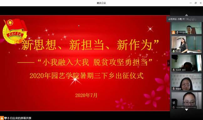 7月24日,园艺学院线上举办2020年暑期“三下乡”实践活动出征仪式暨安全教育大会,会议主题是“新时代、新担当、新作为”——“小我融入大我,脱贫攻坚勇担当”,院党委副书记周娟娟、指导老师马翠兰、方庭和辅导员在院办二楼会议室召开会议, 15支社会实践队(其中校级立项10支)135名学生线上共同参与,院团员青年工作联络员叶一江主持会议。