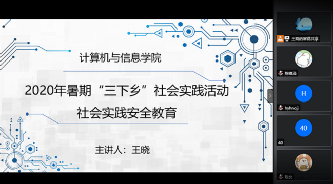 在常态化疫情防控的特殊时期,为更好促进暑期“三下乡”社会实践活动的安全高效开展,7月27日下午,计算机与信息学院针对社会实践活动中的调研方法、采访写作、安全事项、疫情防控等内容开展了线上培训交流会。学院团委书记、辅导员以及全体队员参加此次活动。