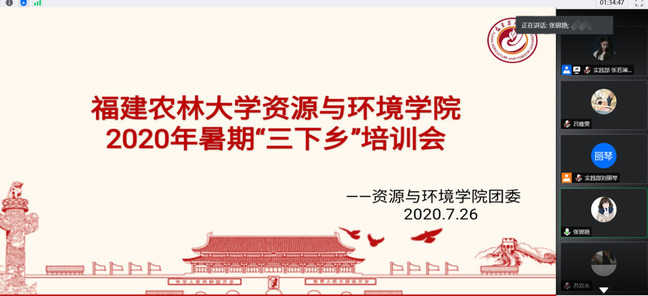 7月26日,资源与环境学院通过线上会议方式举办了2020年暑期“三下乡”社会实践宣传报道提升专题培训会。学院团委书记张锦艳,学院团学干部、学生代表及“三下乡”全体队伍成员参加此次培训会。