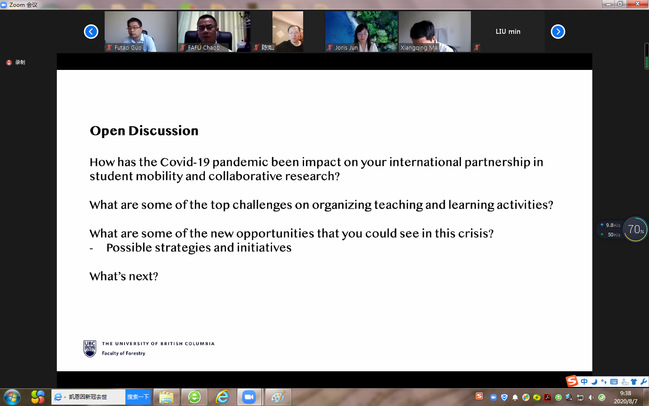 8月7日上午,我校与加拿大不列颠哥伦比亚大学(University of British Columbia, UBC)就当前及后疫情时期如何加强国际伙伴关系、开展林业教育召开了线上研讨会。参加此次研讨会的人员包括不列颠哥伦比亚大学林学院负责人、我校国际处、林学院及国际学院负责人等。