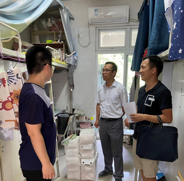 受疫情影响,学生物品堆积在宿舍中存在着较多卫生脏乱问题及一些安全隐患。在走访学生宿舍过程中,曾海滨详细查看了学生宿舍现状,对学生宿舍卫生清洁、宿舍安全等进行了相关的指导,要求政工干部齐心协力地把宿舍卫生和安全工作做实做细,围绕学生、关照学生、服务学生,用实际行动,使特殊时期的思想政治教育更有温度。