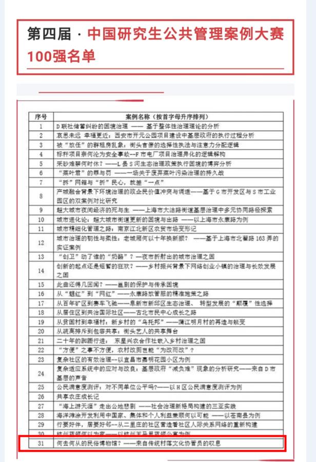 8月16日,由全国公共管理专业学位研究生(MPA)教育指导委员会主办的“案例中心杯”第四届中国研究生公共管理案例大赛落下帷幕。本届大赛共有187所院校、1318支队伍报名参赛。经过文本评选、线上决赛,本次大赛共决出一等奖4个,二等奖12个,三等奖16个,优秀奖68个。公共管理学院2018级公共管理学术型硕士生张莉莉、MPA专业学位研究生虞志菲、张奇等同学组成的“一心向光队”,在郑永平、杨国永二位老师的指导下,以案例《何去何从的民俗博物馆?——来自传统村落文化协管员的叹息》成功入围100强,获得优秀奖。