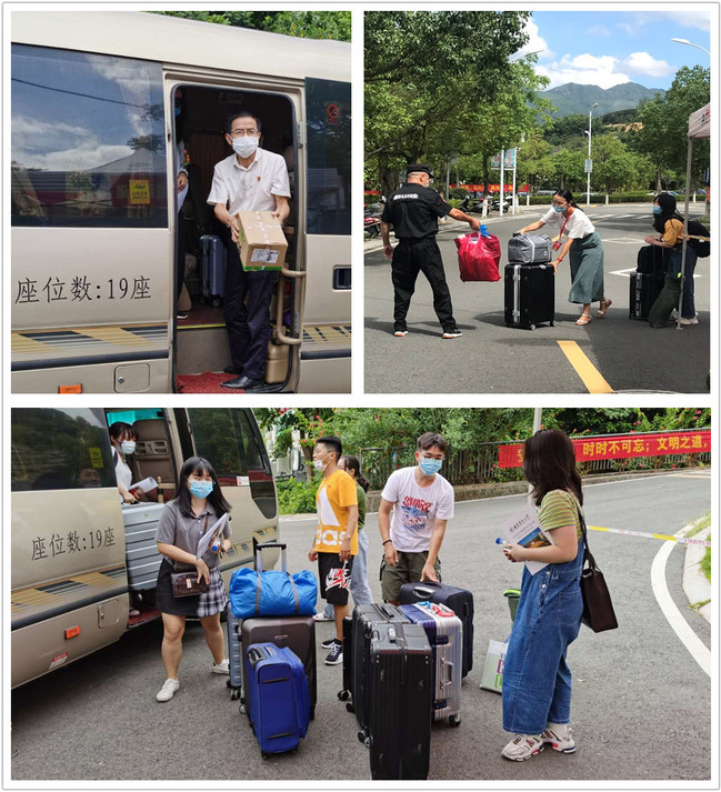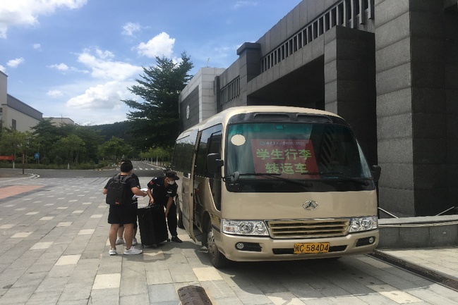 学院在校内安排中转车辆帮助学生转运行李,辅导员、物业保安志愿者为同学们送上返校后的第一份温暖。