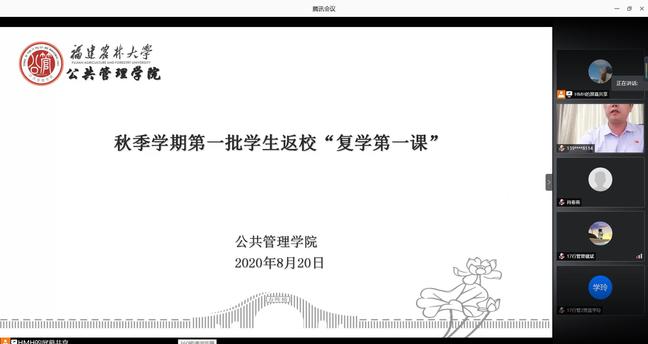 8月20日,秋季学期第一批学生返校开学后,公共管理学院充分运用疫情防控形成的宝贵教育资源,以线上会议的形式,上好“开学第一课”,学院党委副书记、辅导员、2017级全体返校本科毕业生参加。院党委副书记郑龙章就校园疫情防控相关要求,学生进出校园管理、请销假制度、日常体温监测及宿舍管理等要求进行强调,引导学生做好个人防护。郑龙章还对学生的毕业规划、就业形势进行了深入指导,对2017级本科毕业生提出了殷切希望。