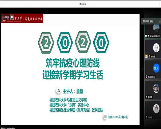 8月23日,马克思主义学院邀请心理学博士詹鋆老师以腾讯会议的形式,线上开展新学期心理健康教育专题讲座,学院全体学生参加讲座。