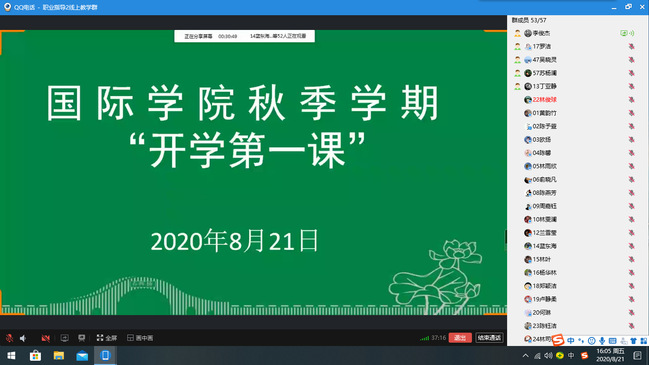 8月21日下午,国际学院通过在线平台组织开展秋季“开学第一课”,2017级本科生辅导员刘妍、李俊杰为2017级英语专业全体本科生授课。