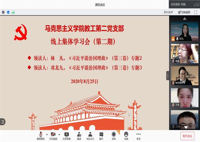 8月25日,马克思主义学院教工第二党支部召开系列理论学习读书活动暨《习近平谈治国理政(第三卷)》第二期线上集体学习会。会议由支部副书记林凡主持,支部全体党员参加会议。