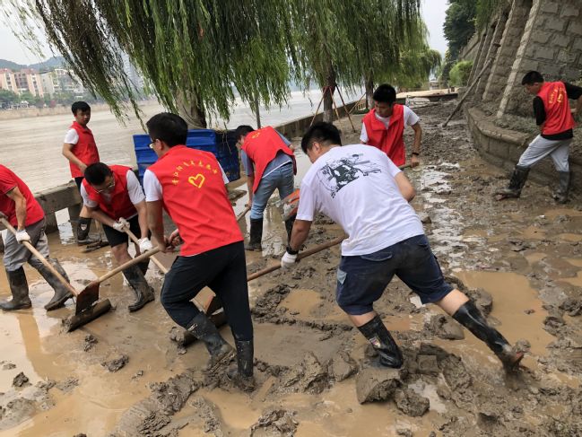 18、19日,成员们作为防汛志愿者,协助当地城管拉上警戒线,并当起了移动的“大喇叭”,积极疏散当地群众,引导他们快速转移,同时帮助当地商户进行物资转移。遇到被困群众,成员李金泰率先跳入水中,逐个抱起被困群众通过路口。20日-24日,洪水逐渐褪去,但城区清淤工作量巨大,研支团三人毫不犹豫地投身城垣社区、滨江路二级阶梯等社区街道的清淤工作,协助消防官兵使用铁锹、扫把、高压水枪等工具进行作业。