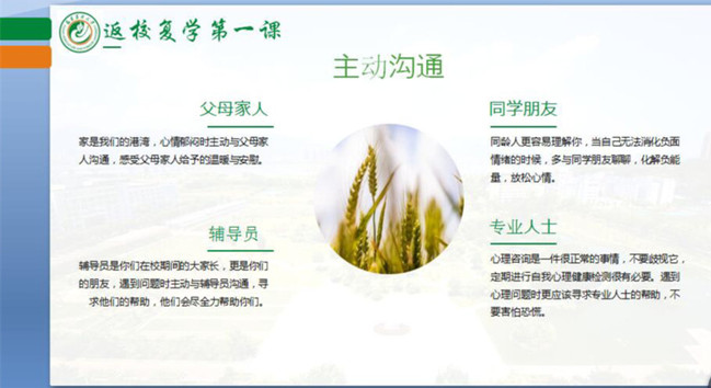 在“返校复学第一课”系列课程中,学院辅导员向返校学生详细围绕大学生心理健康基本知识开展心理健康教育,并从积极抗疫、调整心态、合理规划等角度分析如何应对新学期及就创业、升学压力。