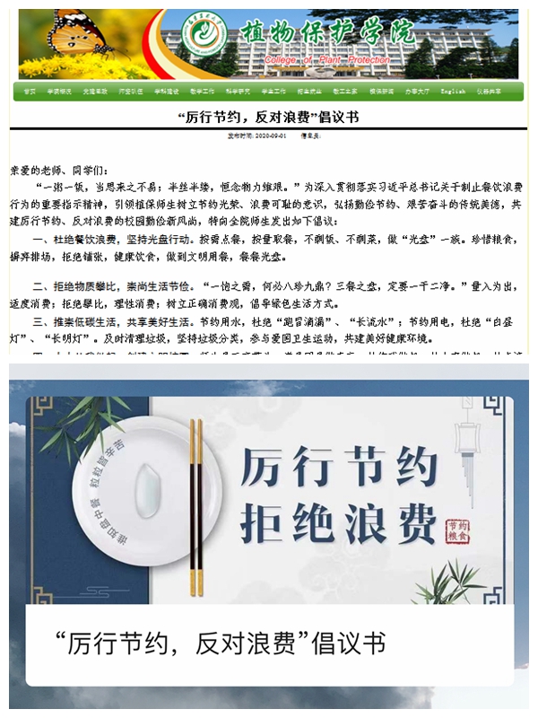 近日,植物保护学院在前期组织学习习近平总书记重要指示精神的基础上,于近期开展了“厉行节约,文明同行”系列活动。