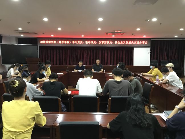 9月2日下午,动物科学学院(蜂学学院)于新圣农楼7楼大会议室开展了党史、新中国史、改革开放史和社会主义发展史“四史”学习分享会,本次学习会以线上线下相结合的方式进行。学院政工干部、在校生代表30人参加了线下学习会,其他学生代表约20余人参加线上学习会。