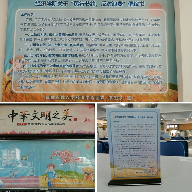 学院通过在南区宣传栏、东苑宿舍楼道宣传栏张贴主题海报,在东苑餐厅的餐桌上摆立“倡议书”桌牌,以随处可见的倡议宣传鼓励学生传承艰苦奋斗、勤俭节约的美德,牢固树立崇俭抑奢意识。学院青年学子积极响应倡议,以实际行动践行“光盘行动”,争做文明餐桌的实践者与推动者。