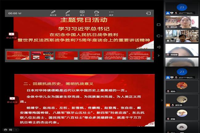 9月5日,马克思主义学院研究生党支部以腾讯会议的形式,线上开展纪念中国人民抗日战争暨世界反法西斯战争胜利75周年主题党日活动。学院党委委员陈文以“学习习近平总书记在纪念中国人民抗日战争胜利暨世界反法西斯战争胜利75周年座谈会上的重要讲话精神”为主题,进行专题党课讲解。研究生全体党员参加会议。