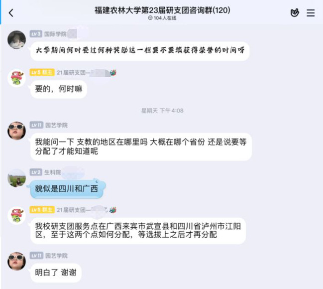 本次宣讲会由校团委主办,第21届研究生支教团承办。21届研支团成员张皓乙、涂皓珉、宋一婧、杨钇、温小婷、江慧、张丹萍、黄国星8人从项目总体情况、服务地情况、支教现状、品牌活动、岗前培训、福利保障、选拔流程和感悟分享等八个方面对我校研究生支教团项目的各个方面进行了详细的讲解,展现了我校研支团立足新时代,展现新作为的良好风貌。“很荣幸能和学弟学妹们分享我们的支教心得,希望能给你们带来实质性的帮助,也希望符合条件的同学积极报名,一同加入我们支教团的大队伍中来。”队长张皓乙说道。分享结束后,还安排了45分钟的线上实时答疑环节,针对同学们的提问进行一一解答。“听了学长学姐们的故事,感觉支教是一件很有意义的事情。希望我也可以加入这个队伍,给当地的孩子们带去我的光和热。”参加宣讲的陈同学说道。为做好今年的招募工作,除了线上召开宣讲会以外,校团委还组建了一个第23届研支团招募咨询QQ群,由21届研支团成员轮班为同学们解答。目前,该群已经吸引了120余名同学加入。