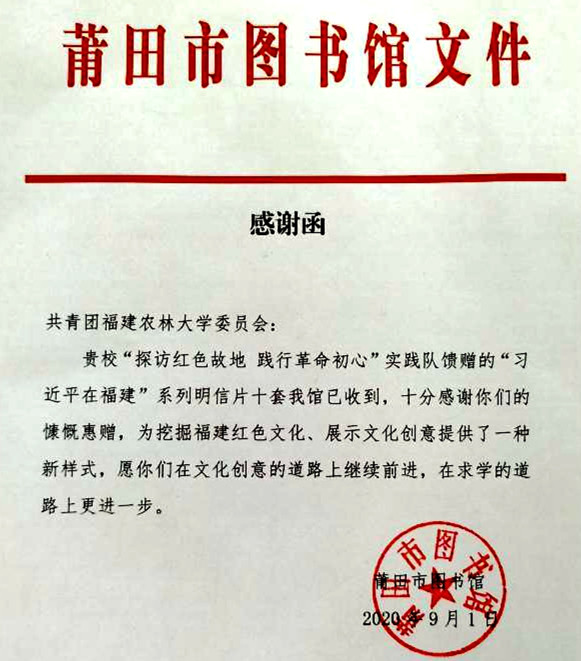 近日,共青团开云网页版委员会收到福建省莆田市图书馆发来的大学生实践队暑期社会实践感谢函,莆田市图书馆对我校计算机与信息学院“探访红色故地,践行革命初心”(指导老师:尤达,实践队成员:郑荧娜、戴海燕、费颖颖、郑陈洁、张芷萱、廖洁如、何伟聪、陈洋)实践队所赠与的“习近平在福建”系列明信片表示衷心的感谢,感谢函中提到,感谢实践队的慷慨馈赠,实践队为挖掘福建红色文化、展示文化创意提供了一种新样式。