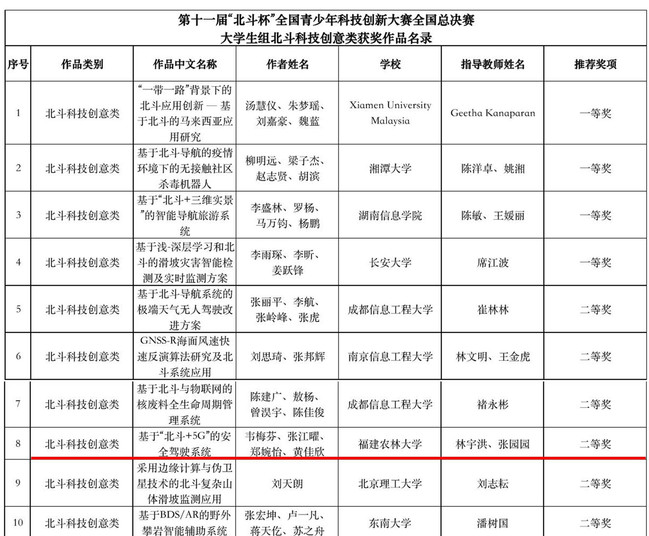 9月7日,第十一届“北斗杯”全国青少年科技创新大赛全国总决赛圆满结束,我校两项作品获奖,其中,交通与土木工程学院作品“基于北斗+5G的安全驾驶系统”获大学生北斗科技创意类国家二等奖(全国第8名,福建省第1名),计算机与信息学院、林学院作品“基于北斗和RFID的昆虫追踪方案”获大学生北斗科技创意类国家二等奖。