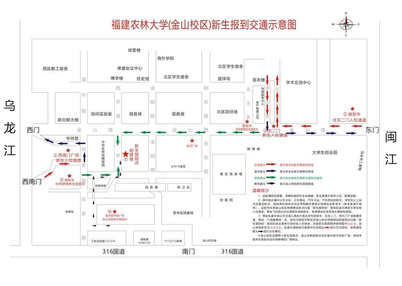 陪同新生到金山校区报到车辆按指定路线、交通指示方向行驶,在“新生入校通道”即停即走,具体如下: