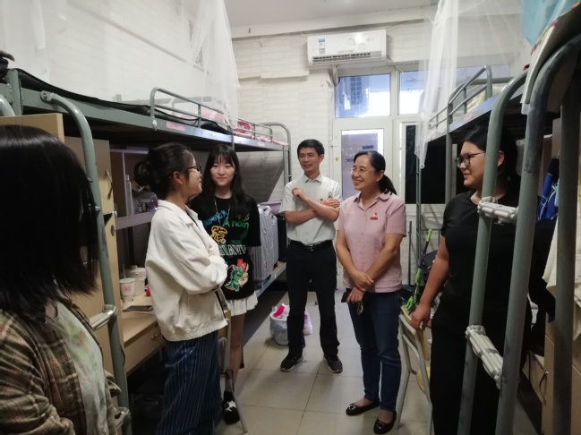 9月22日,国际学院党委书记张华英、院长吴锦程、副院长刘敏和新生辅导员走访2020级新生宿舍。