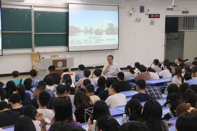 陈建辉回顾了疫情发生以来全国人民在党中央坚强领导下取得的重大战略成果,强调抗疫中彰显的中国特色社会主义制度的优越性。他讲解了上级主管部门和学校关于疫情防控常态化的工作要求,希望同学们认真做好日常体温检测、按时完成健康打卡。他还要求同学注意食品卫生安全、宿舍安全、环境卫生整治,共同推进文明校园建设。此外,陈建辉通过现实案例形象地讲解了关于人身安全、防火安全、防盗安全、防骗安全、经济类安全、意识形态网络安全六大类安全注意事项,给新生上了一堂很好的安全教育课。