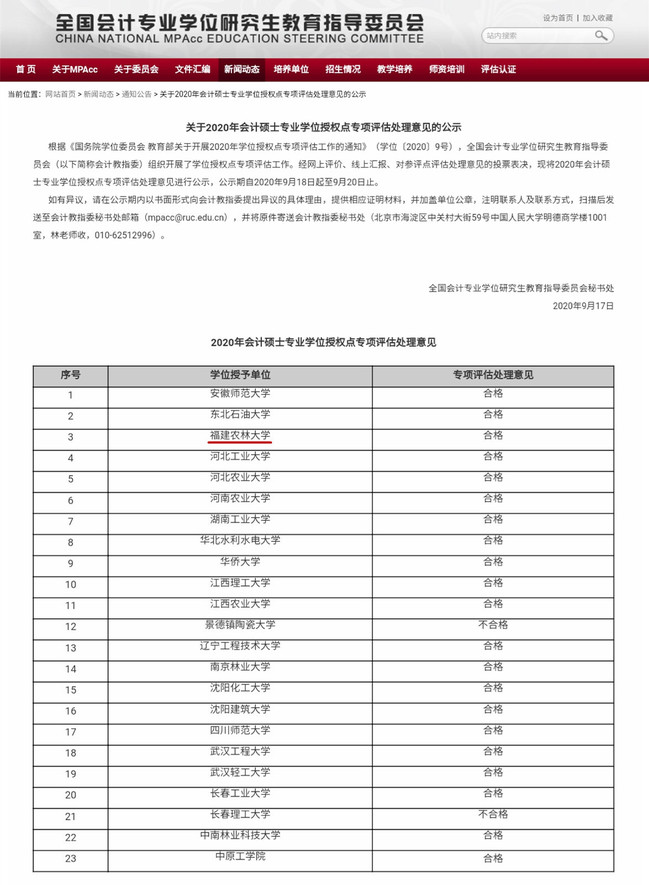近日,全国会计专业学位研究生教育指导委员会组织开展学位授权点专项评估工作。经网上评价、线上汇报、投票表决、评估处理意见公示等环节,我校会计硕士专业学位点(MPAcc)顺利通过合格评估。