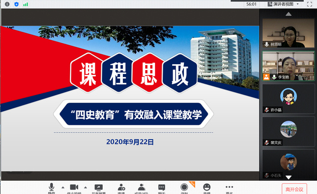 9月22日,由校教师教学发展中心主办、马克思主义学院承办的“四史”教育有效融入课堂教学研讨会以腾讯会议方式召开,全校不同学院不同专业50余位教师齐聚云端,共议研讨,全面推进“四史”进课堂,推动学校课程思政建设,引导大学生树立爱国情怀、成就精彩梦想。会议由马克思主义学院副院长林贤明主持。