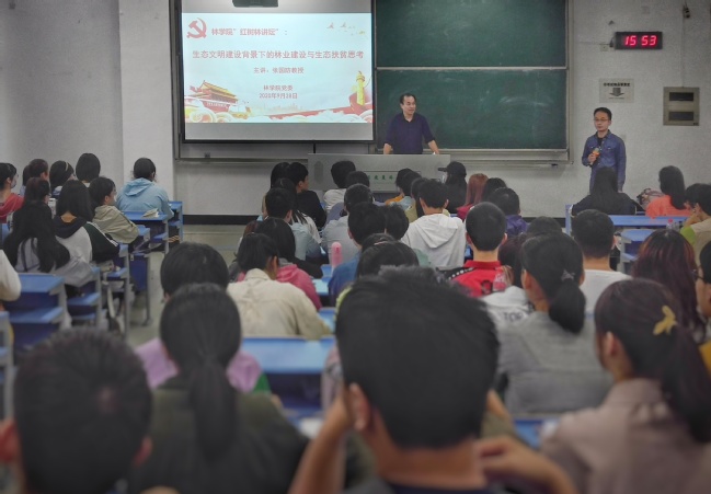 四、举办生态扶贫讲座,强化强农兴农使命。9月28日,学院党委组织开展“红树林论坛”之生态文明建设背景下林业建设与生态扶贫思考,荣获第二届“全国创新争先奖章”的张国防教授用自己30年来奋战在林业教学、科研的生动实践为学院师生讲述了生态文明的重要性、林学大有可为,并寄语农林高校学子要勇担强农兴农使命,积极主动作为,持续践行生态文明建设,守护祖国绿水青山。