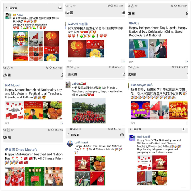 据悉,受疫情影响,尚有部分留学生不能返校,但在国庆中秋双节之际,国内外的留学生们自发通过朋友圈祝福中国。